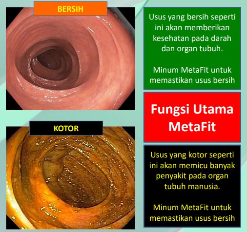 - Manfaat Utama 1: Membersihkan Usus Kotoran yang menempel di usus menjadi sumber penyakit. Kotoran ini mampu dibersihkan oleh MetaFit.